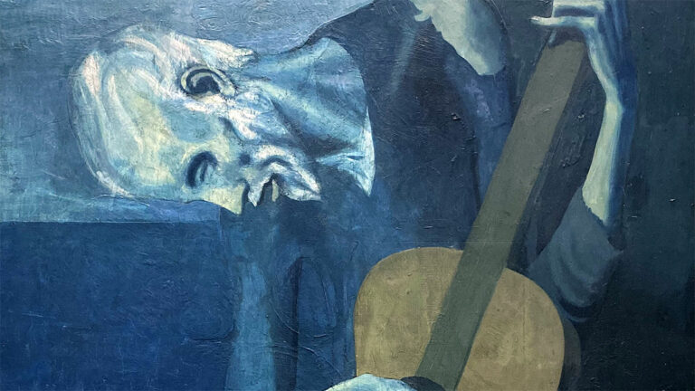 Nei primi anni della sua carriera, Picasso visse un periodo difficile, segnato da povertà e solitudine, che influenzò profondamente le sue opere. Questo momento è conosciuto come Periodo Blu (1901–1904): i colori dominanti sono i toni freddi, soprattutto l’azzurro, e i soggetti sono spesso poveri, emarginati, mendicanti e persone anziane. In questo periodo dipinse anche “Il vecchio chitarrista”, una delle opere più significative. Il dipinto rappresenta un uomo anziano, magro e piegato, che suona una chitarra. La figura trasmette tristezza, dolore e solitudine, e con i suoi colori freddi e l’atmosfera malinconica esprime perfettamente il clima emotivo di quel periodo della vita dell'artista.